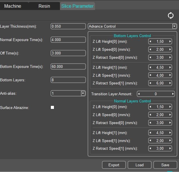 Layer thickness 0,050 mm - Normal Exposure 2.00 sec - Off 0,5 sec - Bottom Exp. 40 sec - Bottom Layer 6 - Z Lift 6,00 mm - Z Speed 4,00 sec - Retract Speed 6,00 sec.