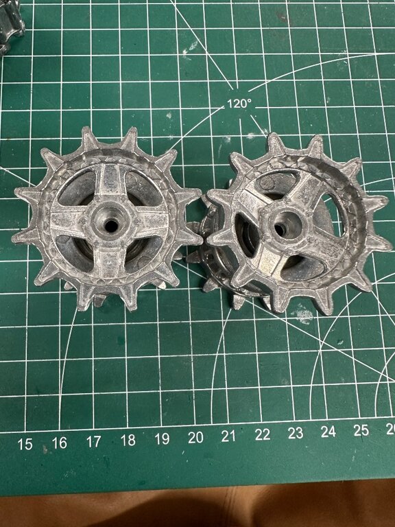 Zur Mischerprogrammierung kann ich dir aber weiterhelfen, da ich nebenbei auch Kettenfahrzeuge in 1:16 gebaut habe. Da gibt es übrigens sehr günstig Ketten von Bruder zu kaufen. Die habe ich aussen mit 2,5 x 2,5 mm Schweißdraht aus Kupfer belegt, das ergibt richtig Grip!